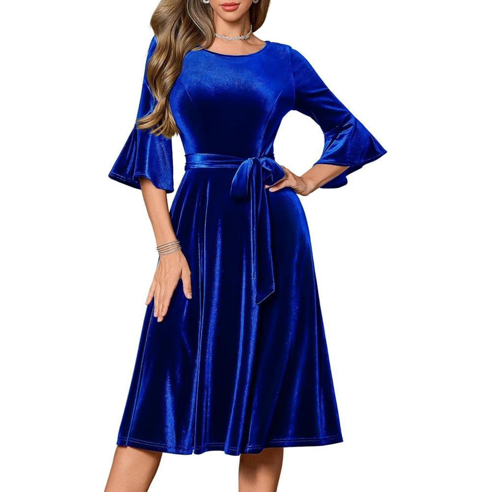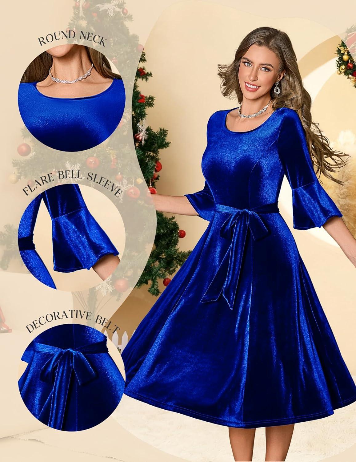 HomRain Women’s Church Dresses for 2025 Wedding Guest Cocktail Tea Party Bell Sleeve Vintage Evening Graduation Dress(Velvet-royalblue)