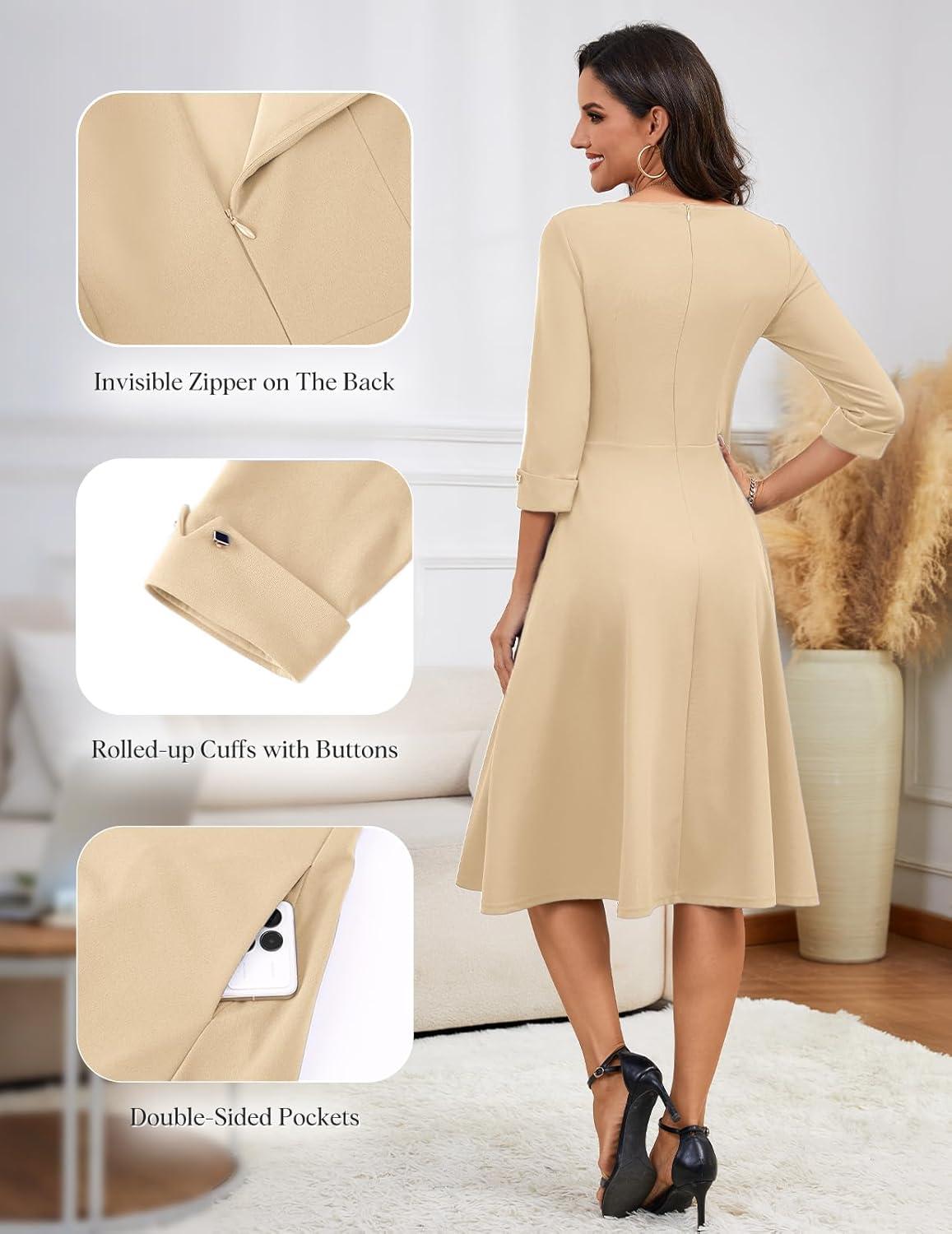 HomRain Women’s Fit and Flare Midi Dress-3/4 Sleeve Modest Church Dress Classy Causal Work Dresses with Pockets(Champagne)