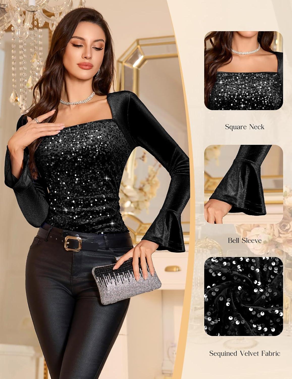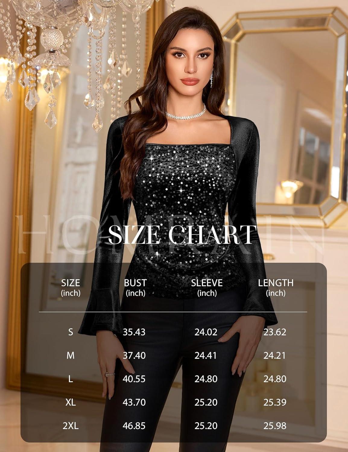 HomRain Women’s Long Sleeve Sequin Velvet Tops Boat Neck Sparkly Party Blouse Evening Holiday Shiny Casual Shirts(Black)
