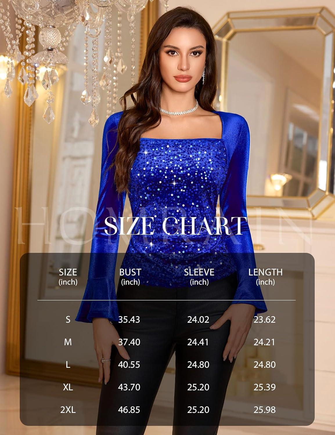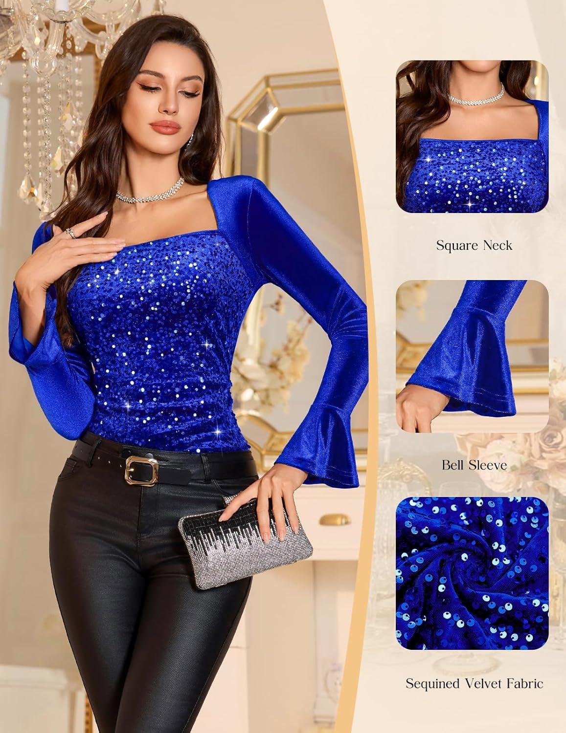 HomRain Women’s Long Sleeve Sequin Velvet Tops Boat Neck Sparkly Party Blouse Evening Holiday Shiny Casual Shirts(Royalblue)