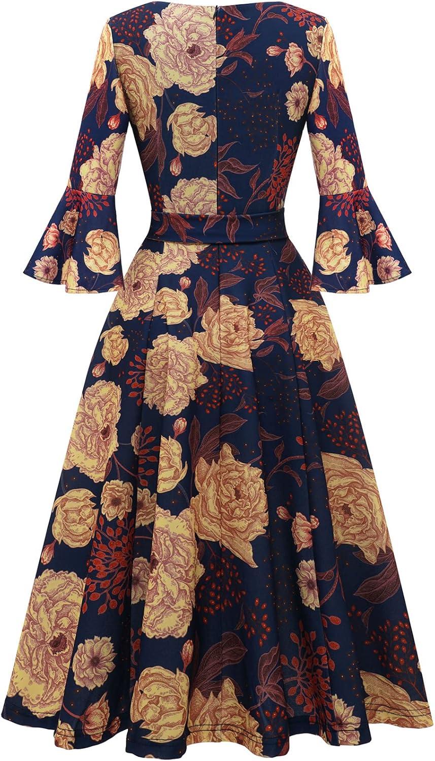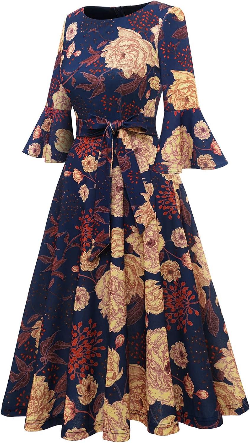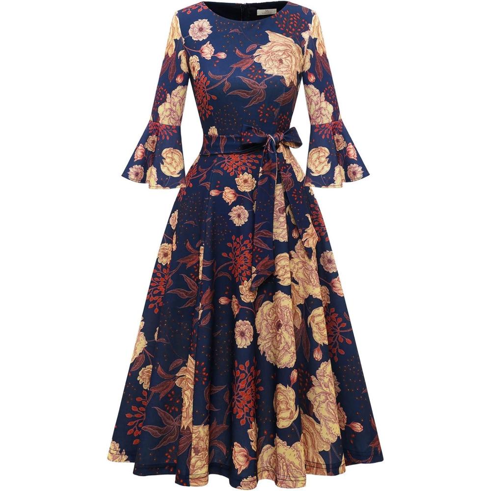 imageHomRain Womens Church Dresses for 2025 Wedding Guest Cocktail Tea Party Bell Sleeve Vintage Evening Graduation DressGlittergrape