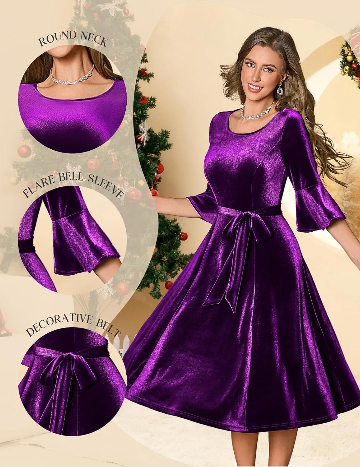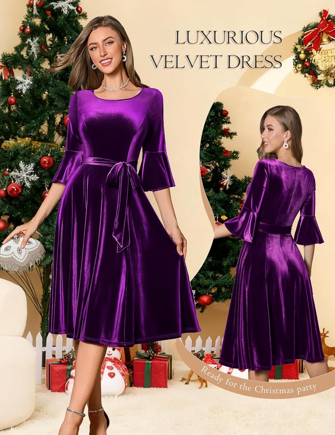 HomRain Women’s Long Sleeve Velvet Midi Dresses for Wedding Guest Church Formal Winter Christmas Cocktail Party(Velvet-grape)