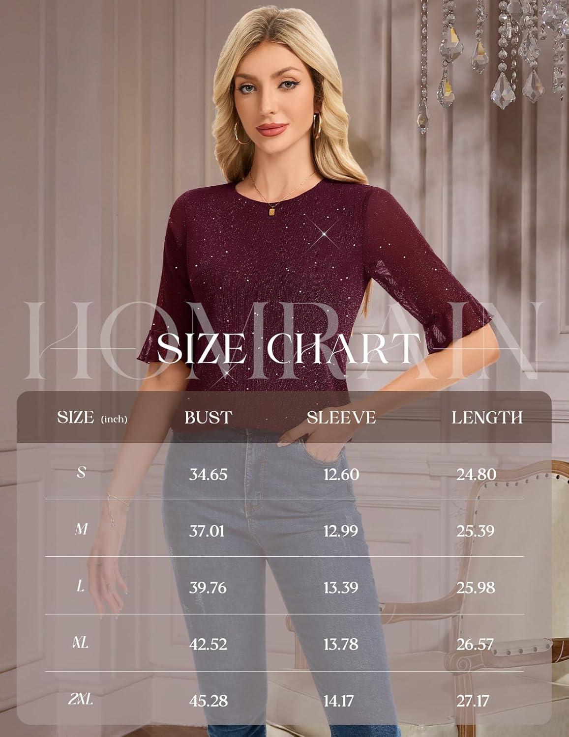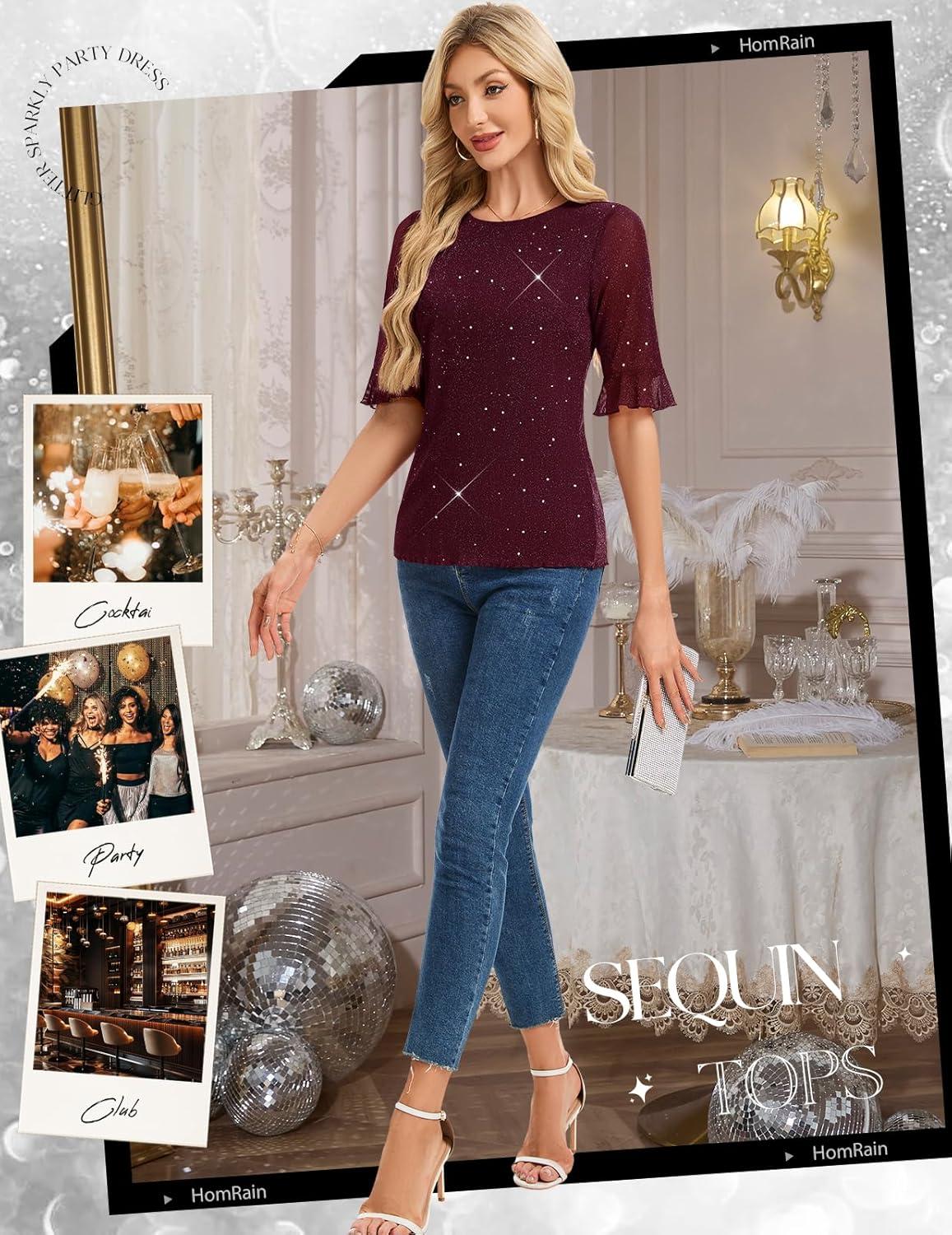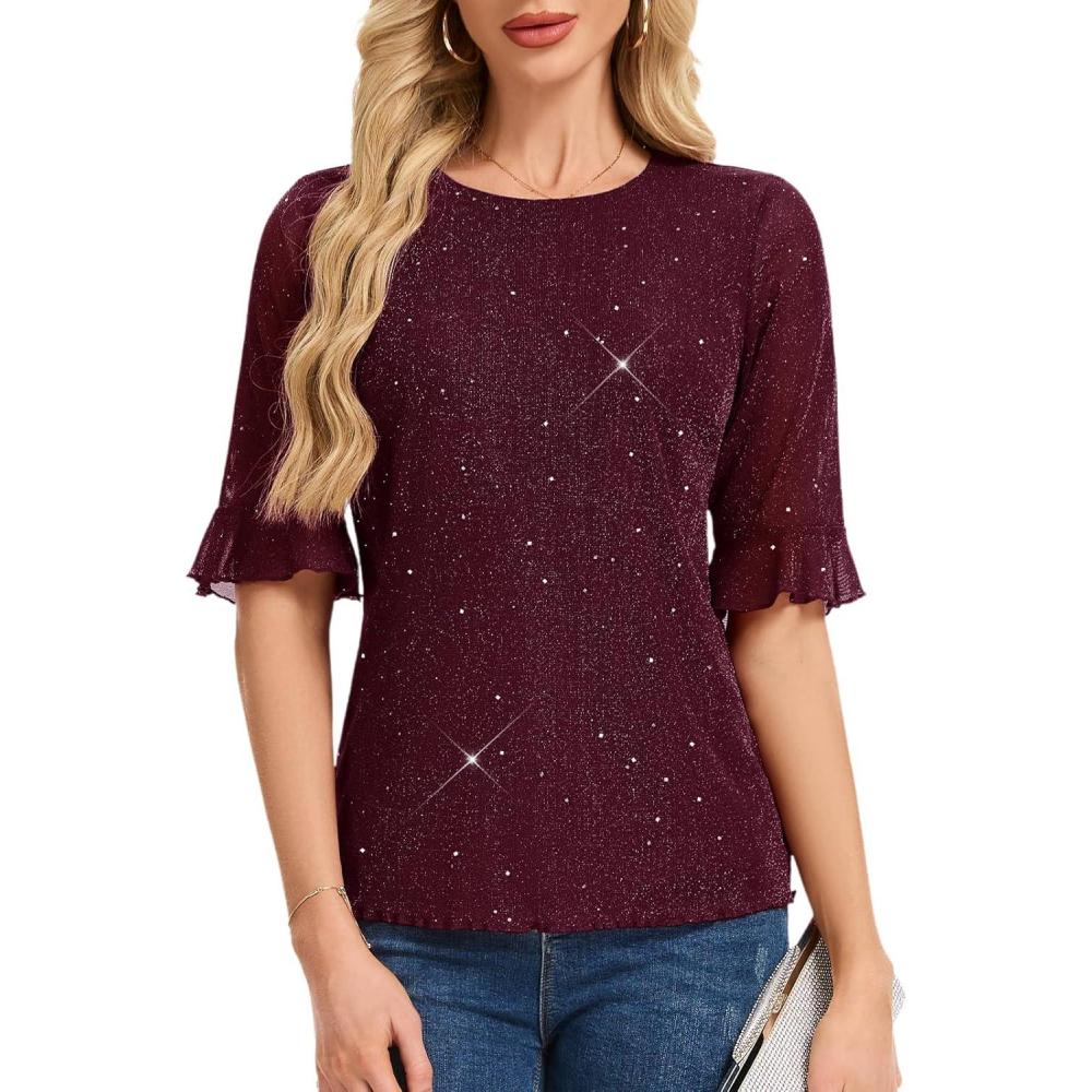 HomRain Womens Ruffle 3/4 Sleeve Sparkle Top Blouses Casual Shirts Crew Neck Glitter Night Out Tops for Elegant Evening(Burgundy)