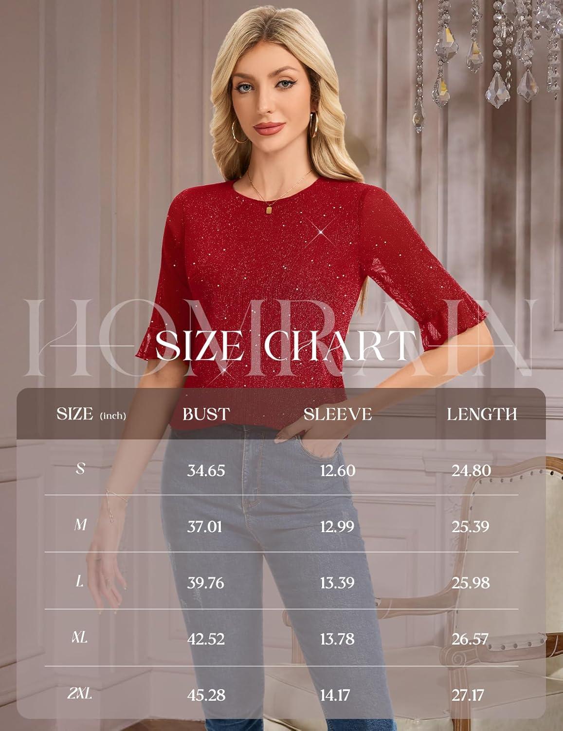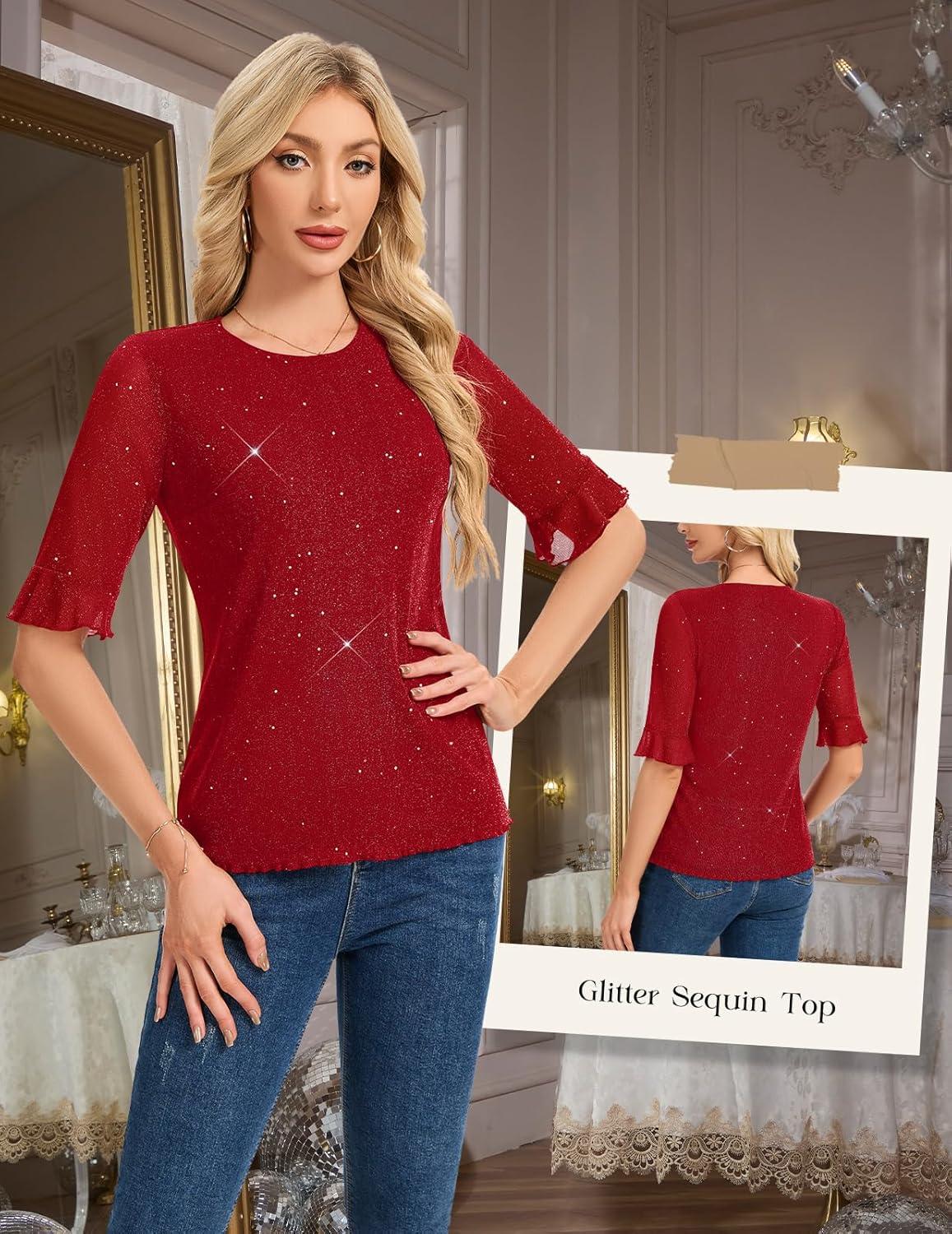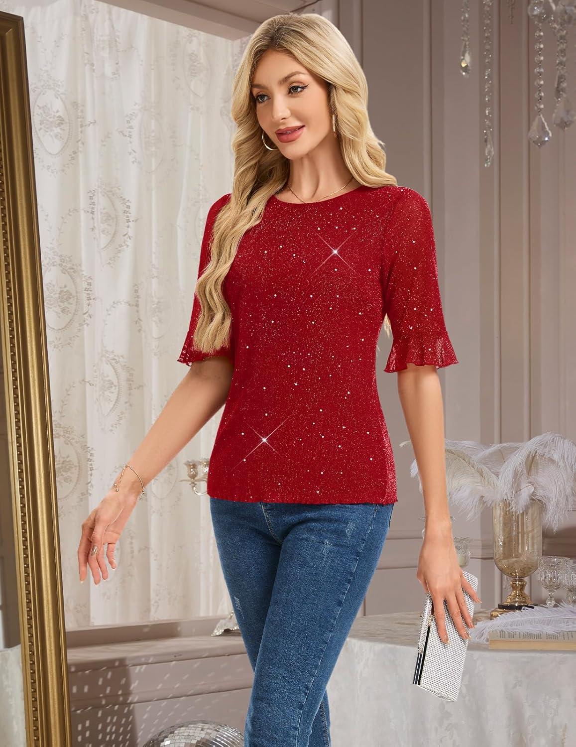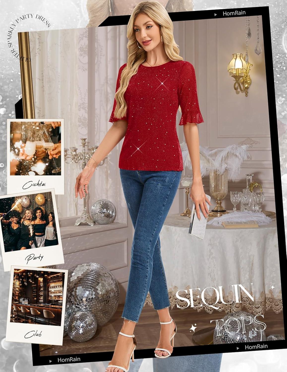 HomRain Womens Ruffle 3/4 Sleeve Sparkle Top Blouses Casual Shirts Crew Neck Glitter Night Out Tops for Elegant Evening(Red)