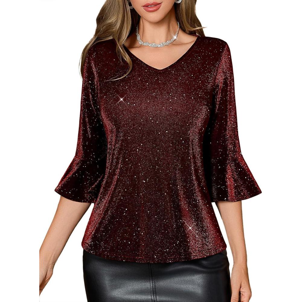 HomRain Womens Ruffle 3/4 Sleeve Sparkle Top Blouses Casual Shirts V-Neck Glitter Night Out Tops for Elegant Evening(Burgundy)