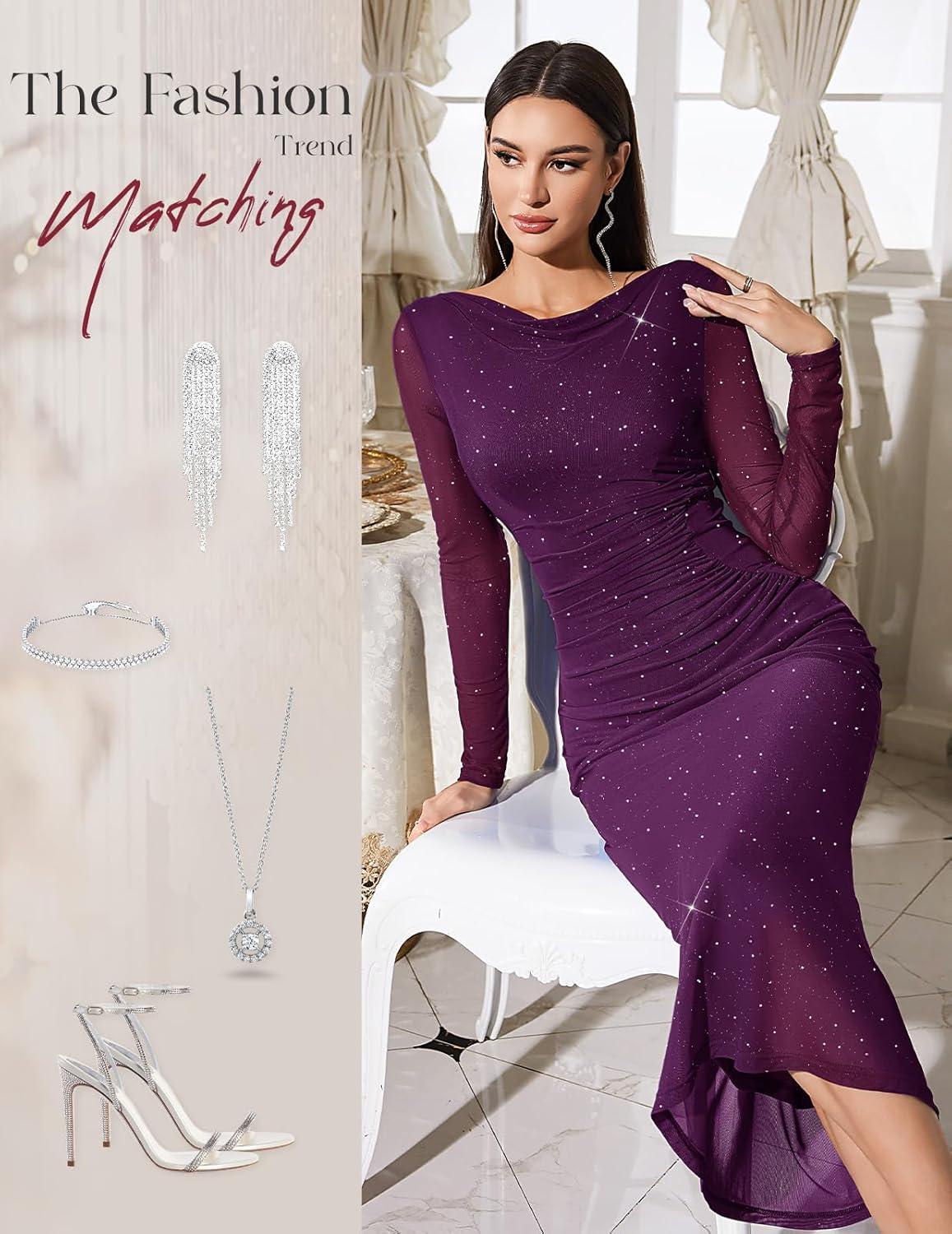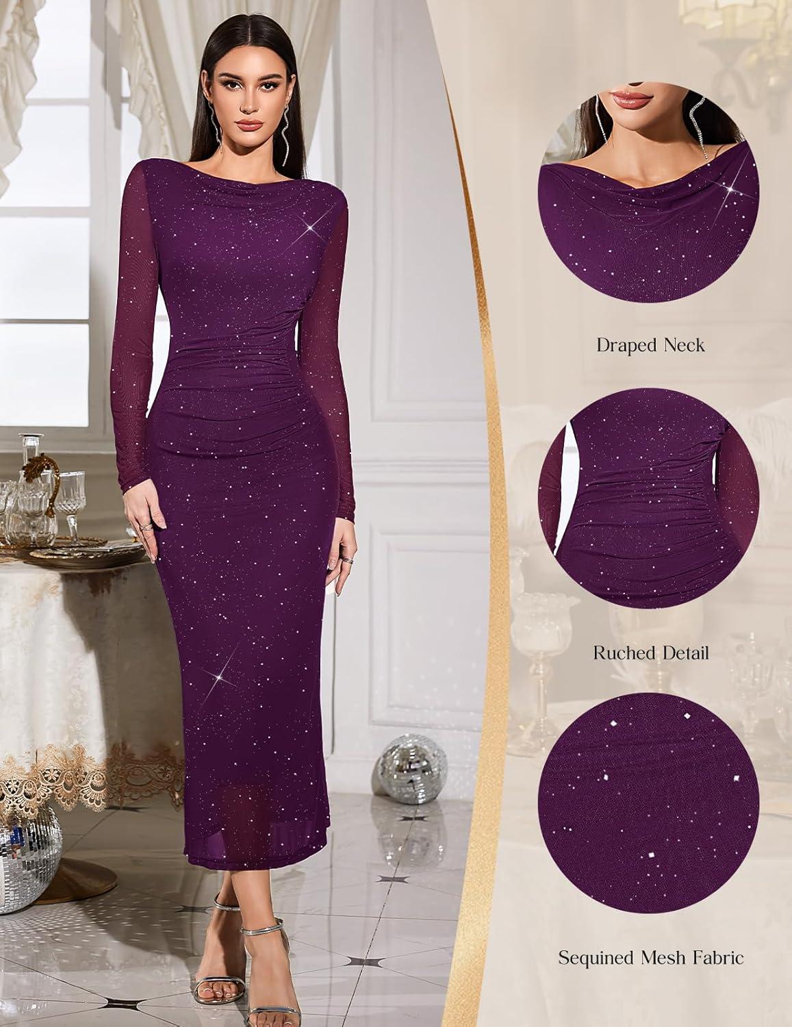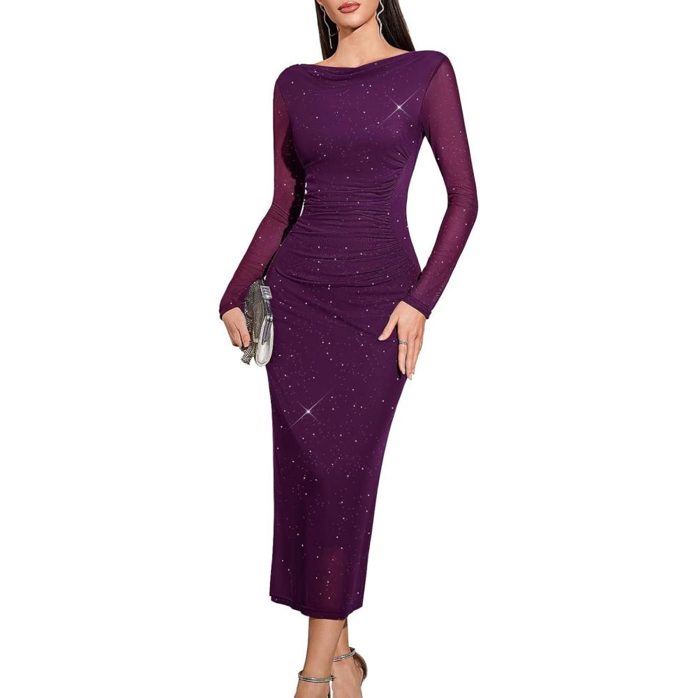 HomRain Women’s Sequin Mesh Maxi Dress Long Sleeve Bodycon Dresses for Fall Party Holiday Club Outfit(Purple)