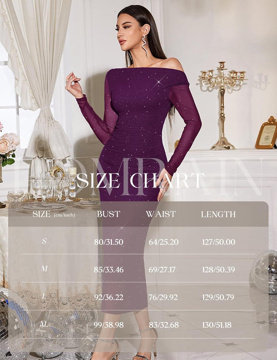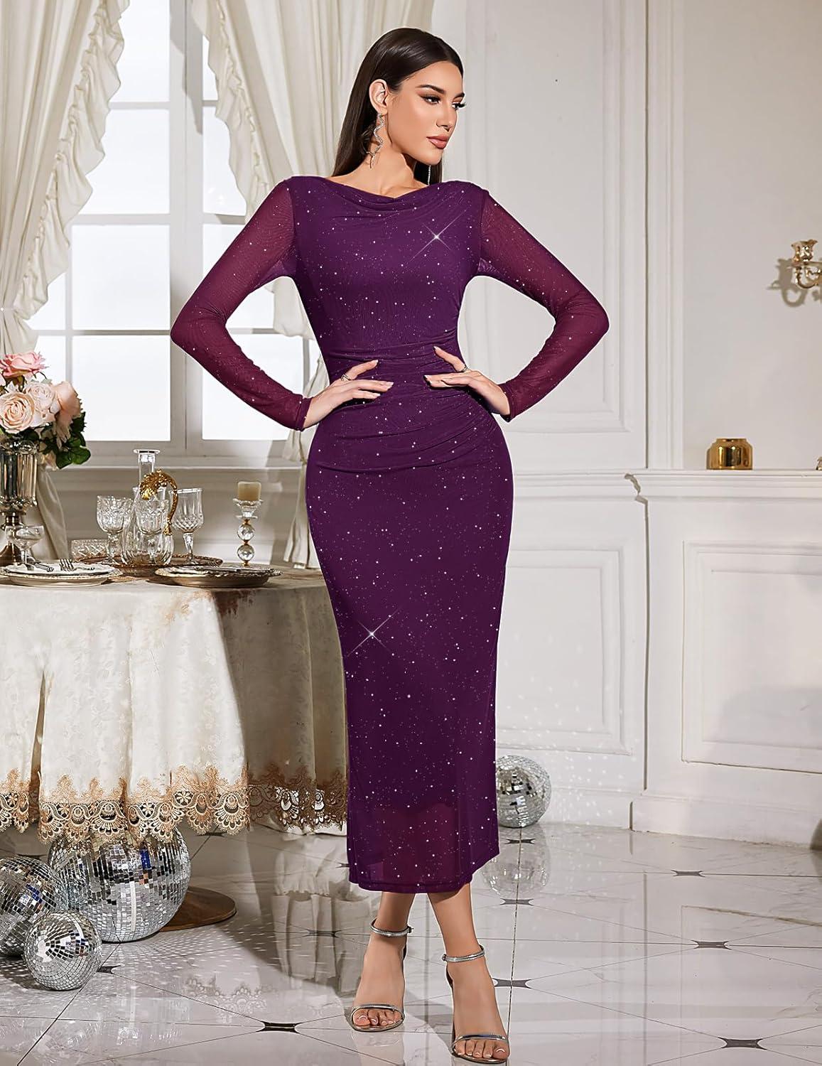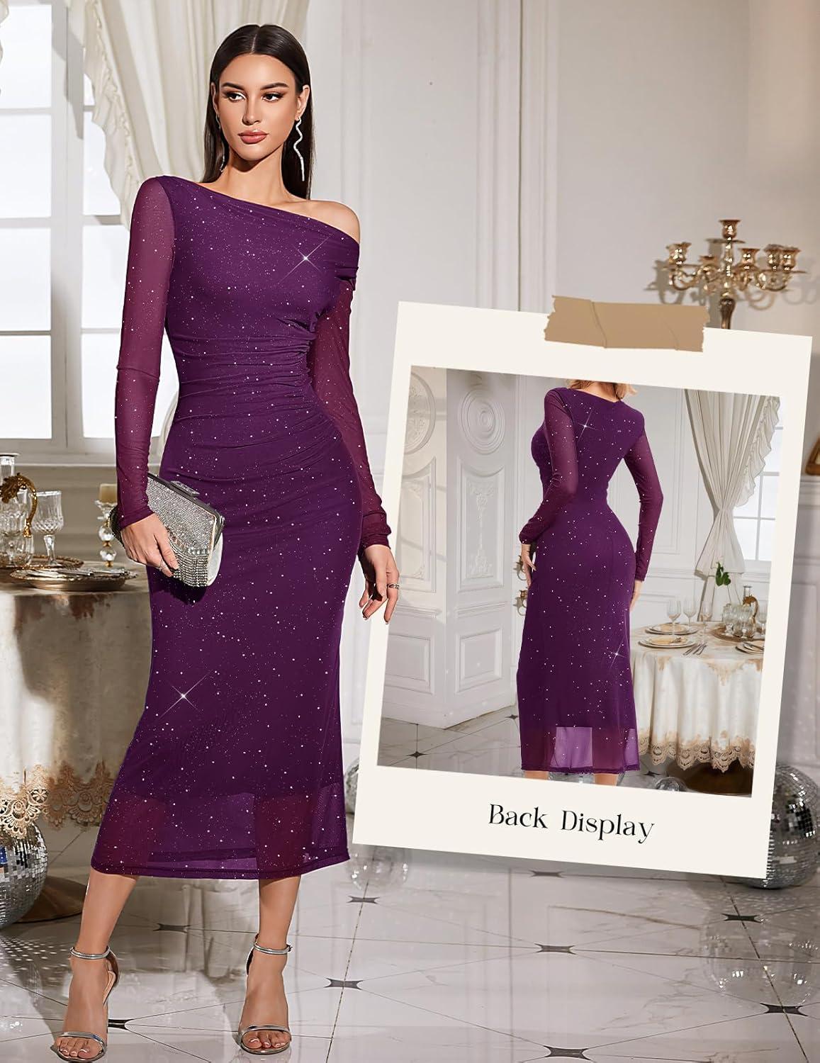 HomRain Women’s Sequin Mesh Maxi Dress Long Sleeve Bodycon Dresses for Fall Party Holiday Club Outfit(Purple)